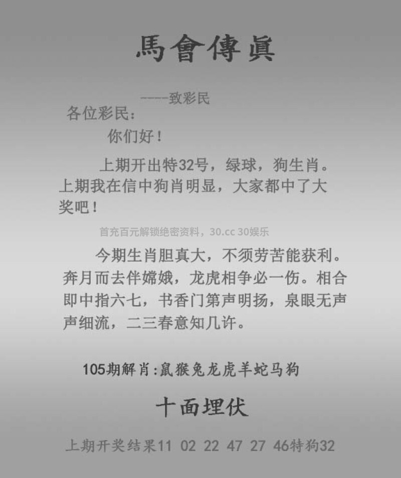 096期:【正版马会传真】{开:羊11} 今期特门一四七,湖中荷花出污泥 双数有码蓝波定,一言九鼎是君王 排行第十有机寻,北方歌谣南方调 特码连双出本期,众生所归欢欢喜 南北通透 综合取肖:虎猪猴鼠龙蛇马羊牛 ![]() |