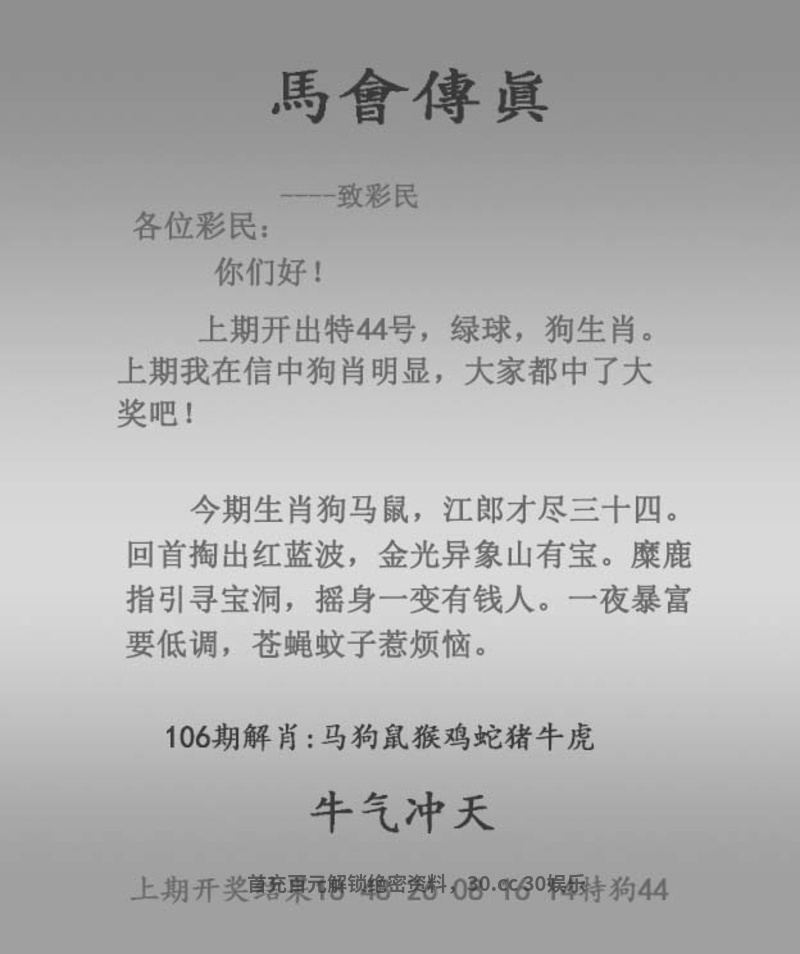105期:绝杀叁肖【兔牛马】开:狗44准 |